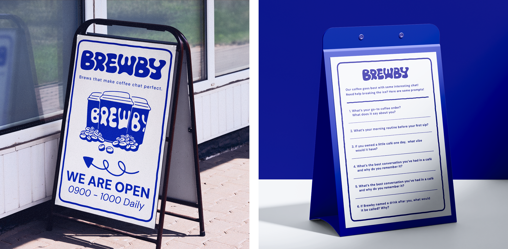 The visual identity combines the vibrant Brewby Blue with hand-drawn illustrations to balance energy and comfort. The bold blue introduces liveliness, while the off-white base and rounded typography evoke warmth and approachability. Together, they revive the spirit of old-school neighbourhood cafés, reimagined with contemporary polish.