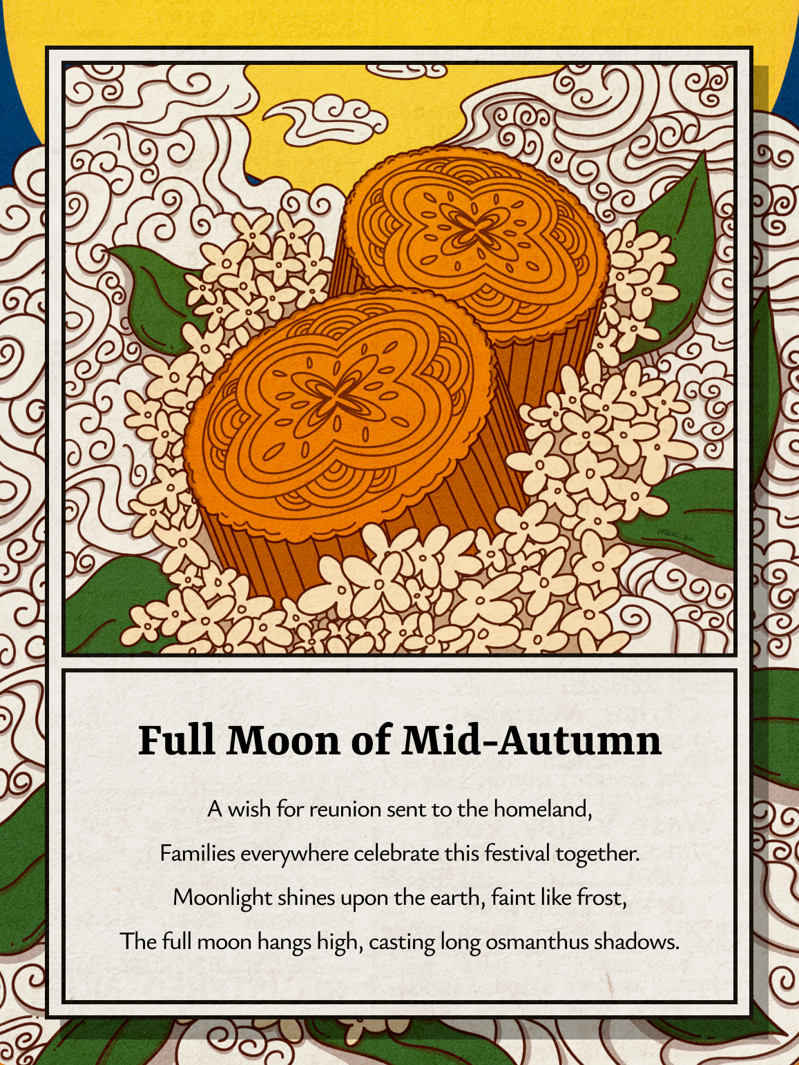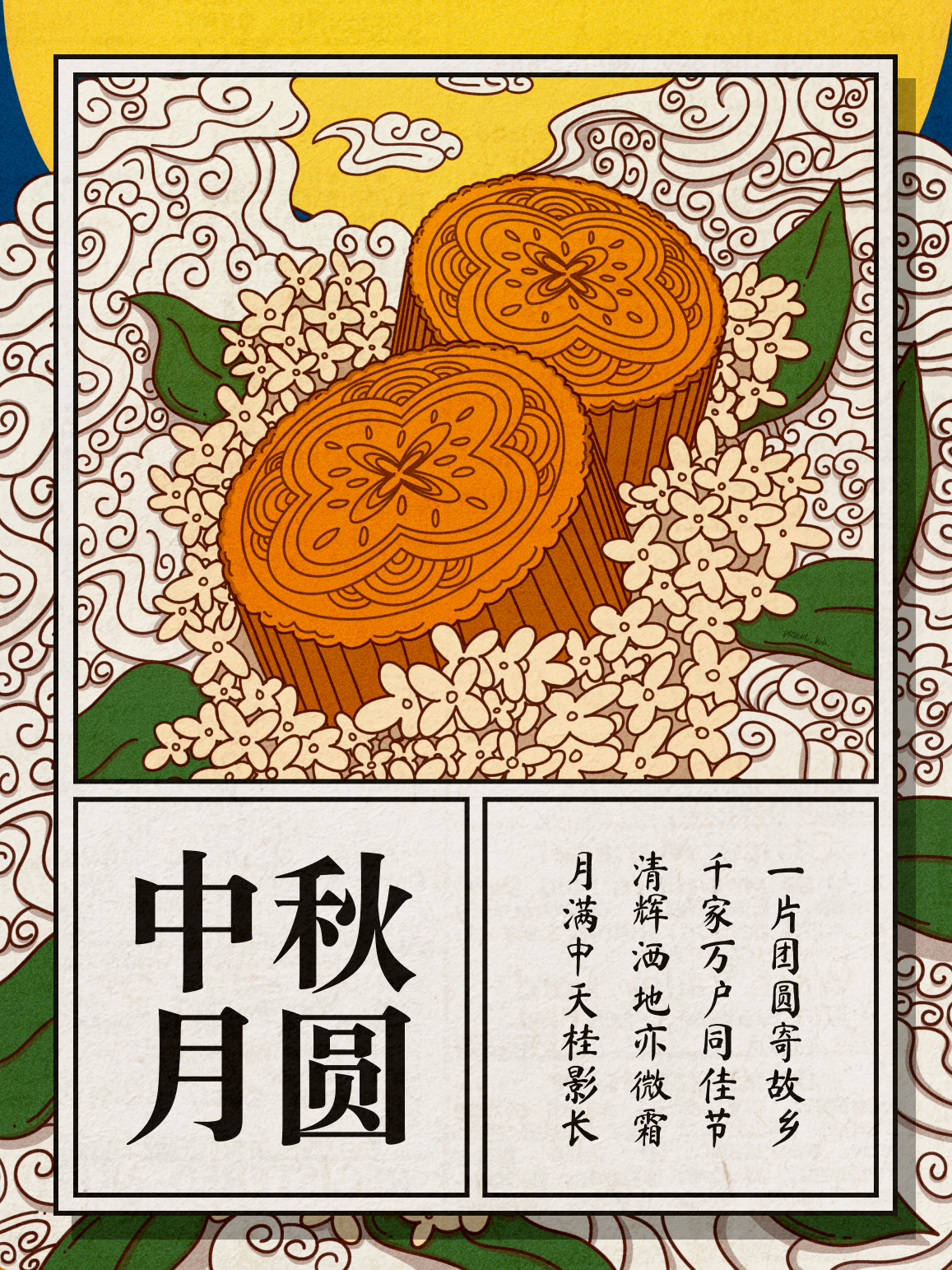 A festive poster design celebrating the Mid-Autumn Festival, inspired by traditional Chinese inspired line work and posters. The artwork pairs the signature full moon, clouds, osmanthus flowers, and mooncakes to symbolize reunion and prosperity.