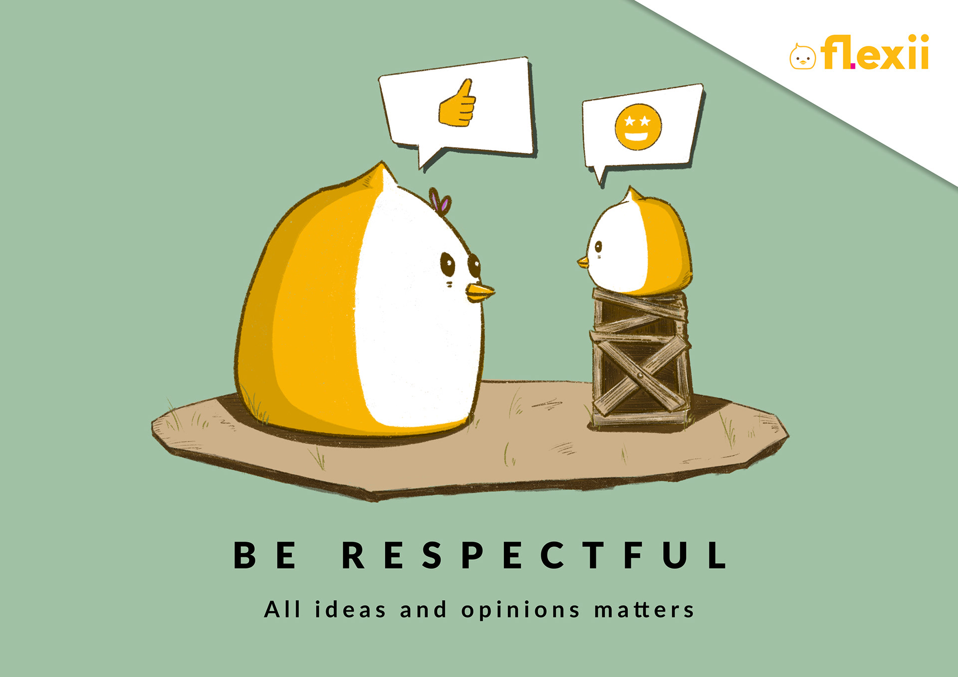 I was commissioned to produce a series of posters depicting the 4 values Flexii as a team aims to adhere to, which was part of the newly updated Mission, Vision & Value of the brand. The illustrations were created based on the chick mascot of Flexii, with various different scenes that depicts communicates the value itself while at the same time, stays in line with the brand visual direction of being playful and energetic.